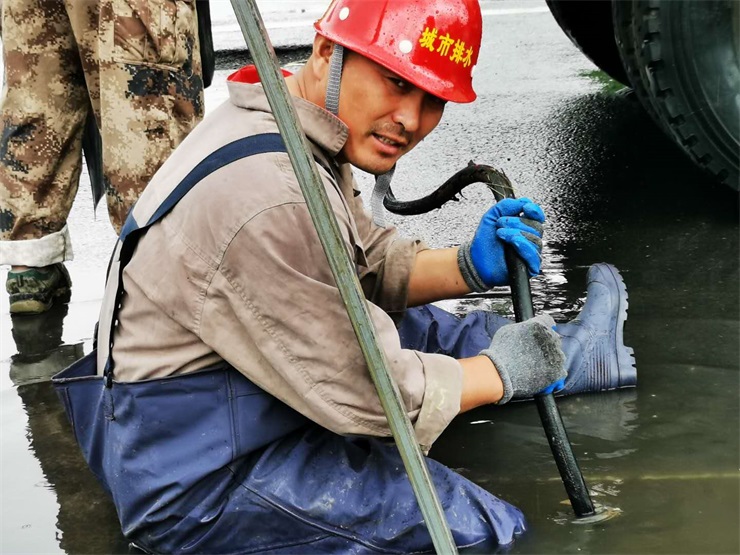金怀思查找下游井口,夏正文开雨水篦,探查管口走向,到达现场随着一道道指令发出抢修迅速工作展开;找不到管口,夏正文用脚试,疏通枪口放不进管口,坐在水里往里送;清淤、疏通、排涝,经过近3小时的冒雨“作战”积水退去,而突击队员们整理设备、清理满身污污渍,又将奔赴另一个“战场”……